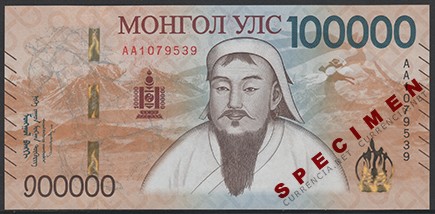 かつて、ユーラシア大陸を跨ぐ大帝国を築いたチンギス・ハーンの肖像画があしらわれています。現行券シリーズ