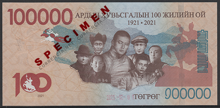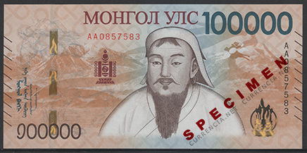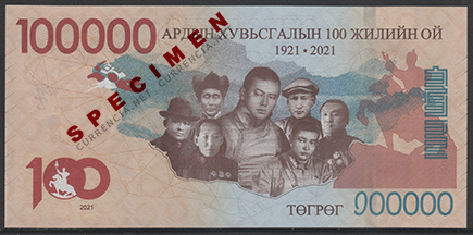 備考:通常の最高額紙幣「2万トゥグルグ」券の5倍となる記念紙幣。2021年に発行予定されていたが、何らかの理由で発行されなかった。2025年末ごろから貨幣収集家を中心に売買が始まったようだが、詳しいことはわかっていない。